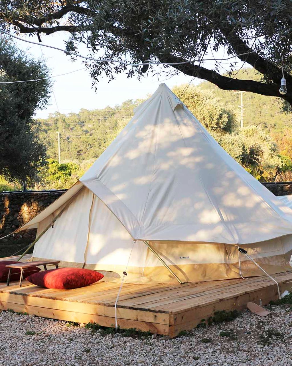 Ruina Glamping'de, zeytin ağaçlarıyla çevrili, tam donanımlı bir lüks çadır sizi bekliyor olacak. Doğada olmayı arzulayan ve aynı zamanda lüksünden ödün vermek istemeyenler için farklı bir tatil seçeneği sunuyor. Ruina Glamping'de, 14 metrekarelik 10 adet glamping çadırı bulunmaktadır. Çadırlardan ikisi tek kişilik 2 ayrı yataktan, sekizi çift kişilik yataktan oluşmaktadır. Çadırda mini bar, vantilatör, ayna, komodin, kilim, sehpa ve 2 adet minder bulunmaktadır. Banyo ve WC ortak kullanıma tabidir. Her bir çadırda kişiye özel banyo, el havlusu ve şampuan bulunmaktdır. Banyolarda sıcak su ve saç kurutma makinesi mevcuttur. Fiyatlara kahvaltı tabağı dahildir. ( domates, salatalık, biber, 2 çeşit peynir, 2 çeşit zeytin, bal, kaymak, salam, haşlanmış yumurta, tereyağ, kuru kayısı, ceviz) Dışarıdan yiyecek, içecek getirmek serbesttir. Yemek yapmak isteyen konuklar için ortak kullanıma tabi 2 adet tam donanımlı açık hava mutfağı bulunmaktadır. Mangal yakmak isteyenler mutfaktaki mangalları ...